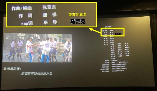 虽然我和菠萝参与的部分很少,但作为作词人,我和菠萝全程都很紧张,一直处于一种“不知道什么时候会放歌”的忐忑中。等真正那段音乐出来的时候,我更是面红耳赤,几近晕厥,脚趾把电影院抠出了地下一层。菠萝全程匍匐在我背后,连连颤抖,看来是激动坏了。