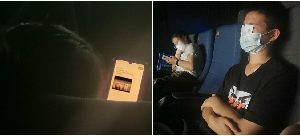 在观影过程中,有两个人中途离场了,我没有拍到他们,因为他们走得实在是太快了;我前面的人早早编辑了票圈,可能想记录下这独特的观影经历;同事14岁弟弟则安详地把影票插在了口罩上,应该是他们这个年龄独有的致敬手法。