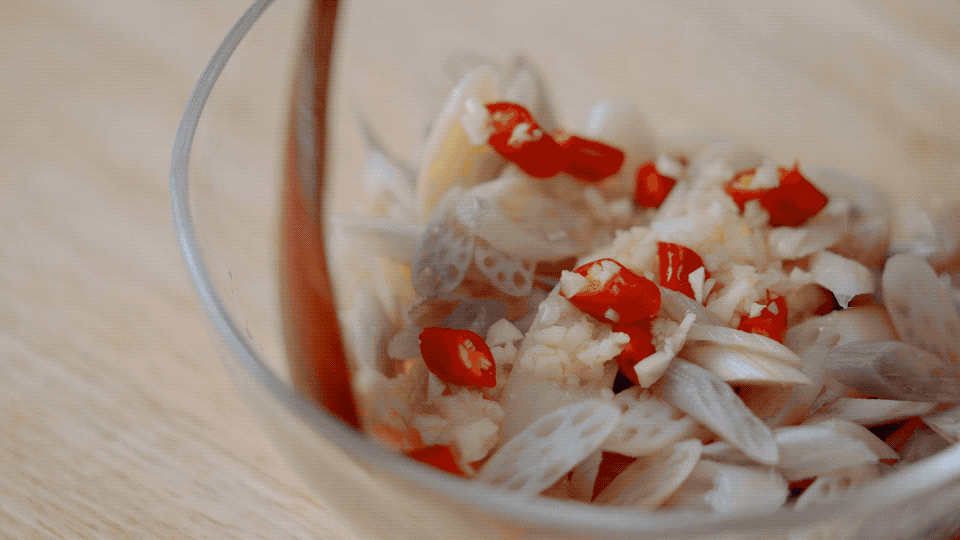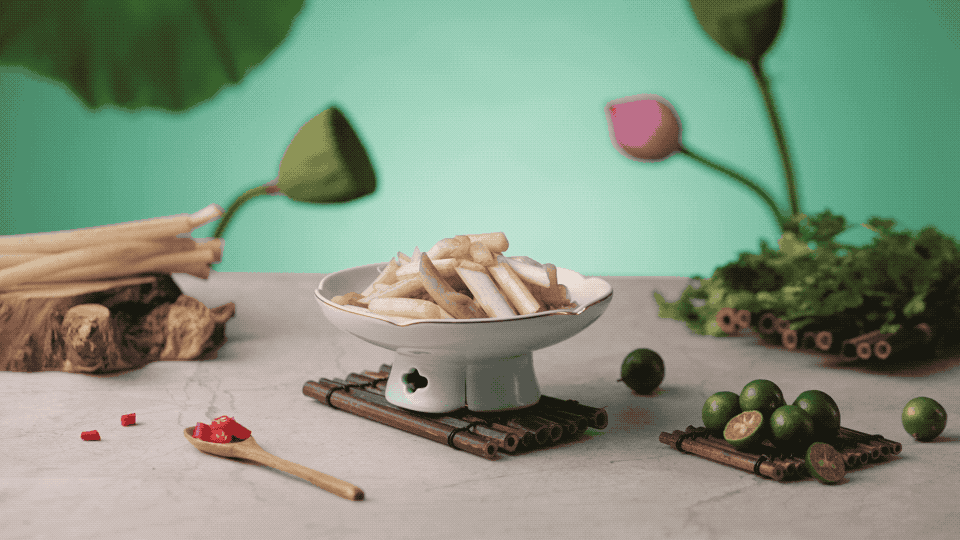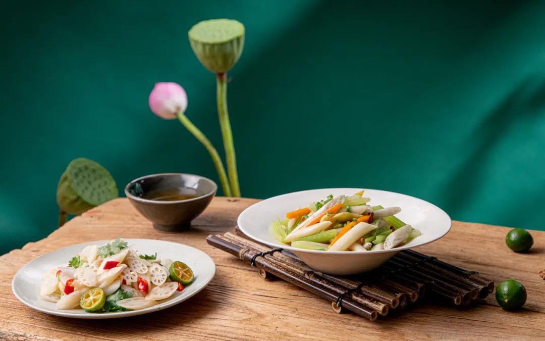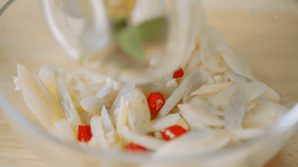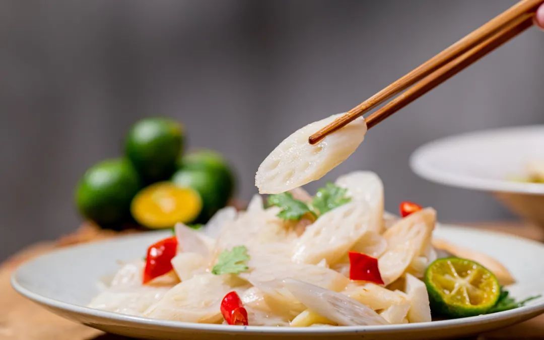第一道我们做不用开火的泰式青柠拌藕带,清甜爽脆。