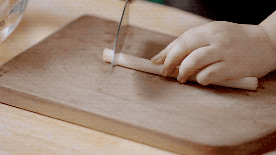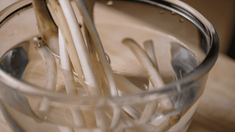 藕带斜切成段,这样切面比较大的话容易入味。切好的藕带极易氧化变黑,最好放在盐水中浸泡,防止它接触到空气。如果它已经氧化了,你可以用钢丝球在其表面轻轻擦拭,也能让它变回白嫩样。