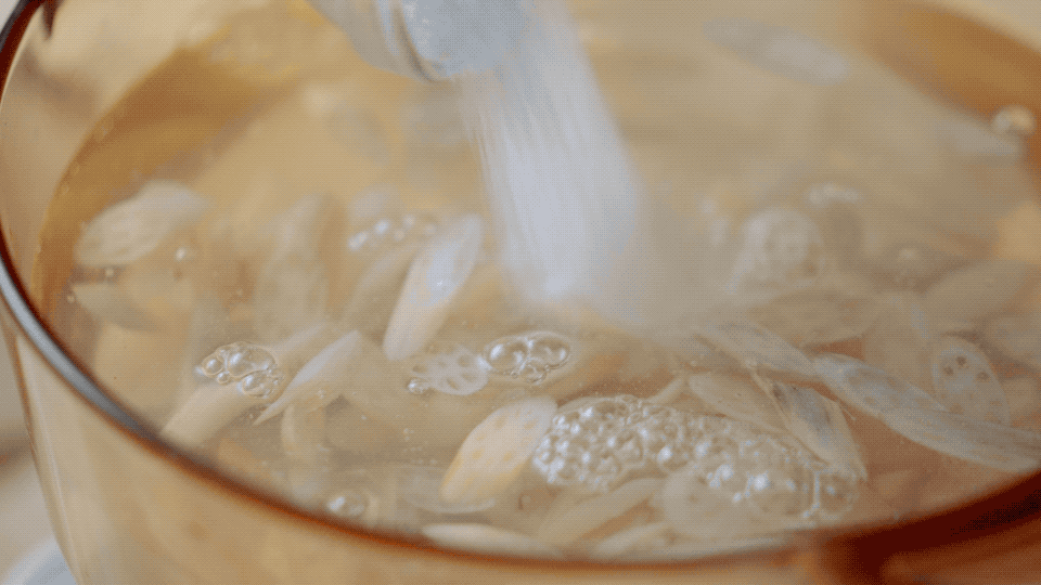下面给藕带“洗个澡”,锅内放清水,水开后放入藕带和盐,焯水两分钟左右捞出。