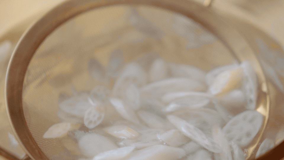 放入冰水浸泡,这样做能增加藕带的脆爽度。