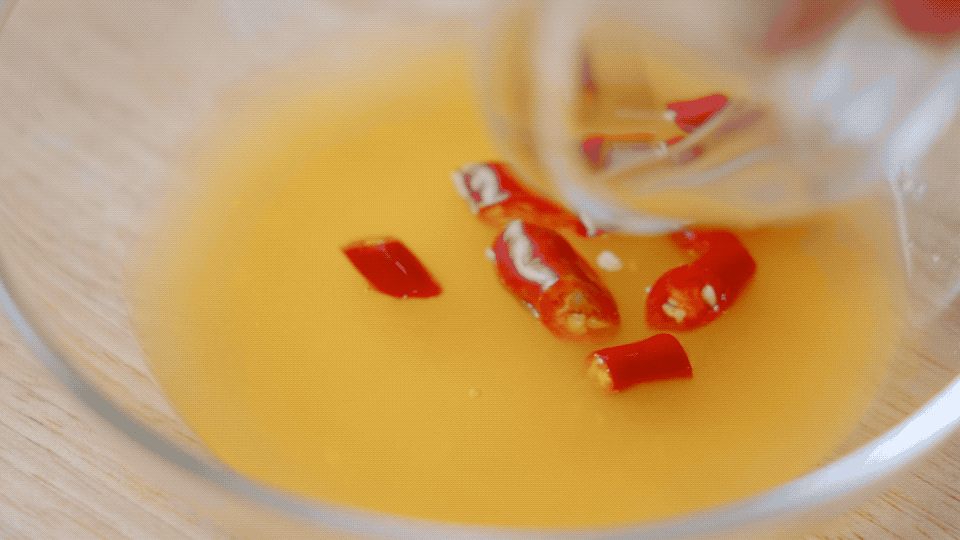 青柠汁加入蒜蓉、小米辣和鱼露,搅拌均匀。这个万能酱汁味道特别清爽,吃起来还带着青柠的香气,学会它,你能拌一切。