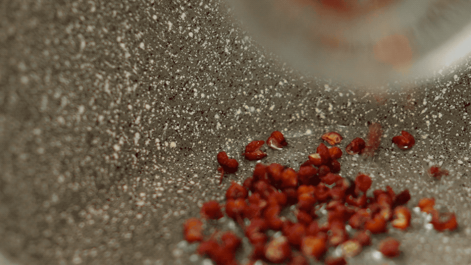 在锅里倒油,将花椒、姜片、蒜片在油锅里爆香。
