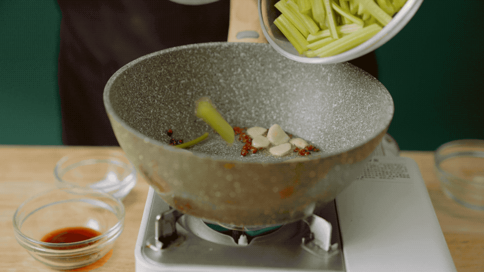 倒入准备好的香芹段,加入生抽提鲜,爆炒1分钟左右。注意一定要控制爆炒的时间,炒老了口感就打折扣了。
