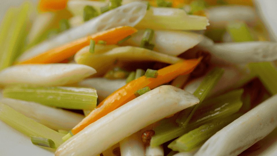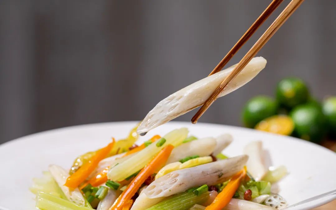 等到它完全入味后,最后再放入香菜碎和去籽的小青柠,拌匀即可,快手又简单,口感酸甜清爽,是夏天开胃的不二之选。02|泡椒芹菜呛藕带