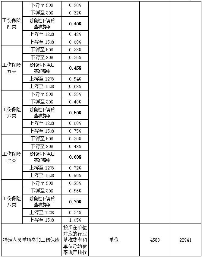 三、特定人员单项参加工伤保险缴费基数下限调整为4588元,上限调整为22941元。
