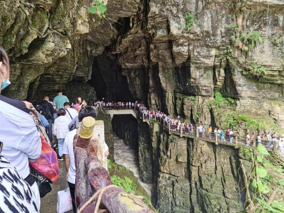 “山青水绿空气清新,这里真是名副其实的天然氧吧。”7月22日,由湖北中旅假日旅游社恩施分社承接的千人大团走进腾龙洞景区。大巴车陆续驶入景区停车场,千人游客齐聚腾龙洞景区开启洞穴神奇秀丽的氧吧之旅。游客对这里的别有洞天、卧龙吞江赞叹不已。