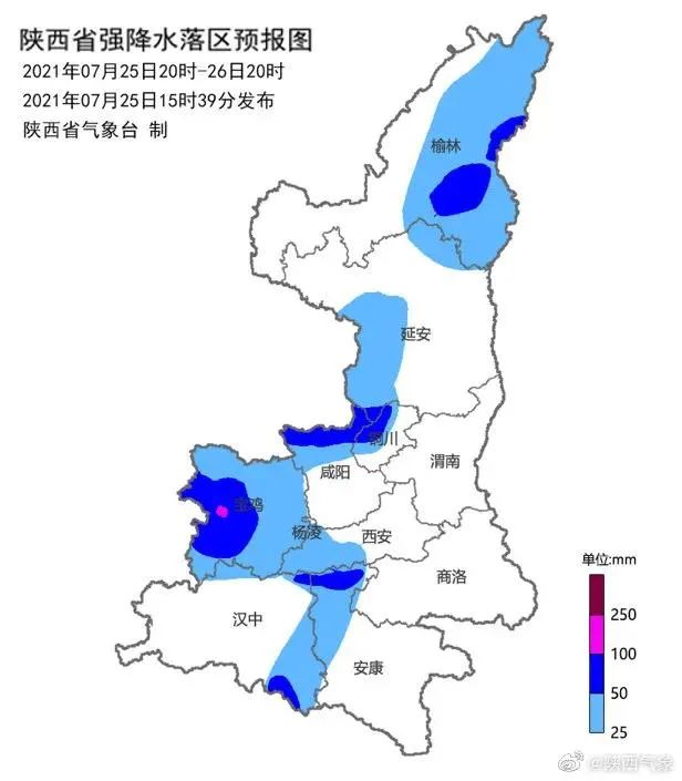 受高空槽和低层暖湿气流共同影响,预计7月25日20时至26日20时榆林东部、延安西部、咸阳北部、铜川部分、宝鸡、西安南部局地、安康北部局地、汉中东部局地将出现大雨(25-50毫米);榆林东部(神木、佳县、米脂、子洲、横山、绥德)、铜川部分(宜君、印台、耀州)、咸阳北部(长武、彬州、旬邑)、安康北部局地(宁陕)、汉中东部局地(镇巴)有暴雨(50-80毫米),宝鸡(宝鸡市区、陇县、凤县、千阳)有暴雨(50-80毫米),局地(宝鸡市区)可能有大暴雨(100-120毫米)。本次强降水主要出现在25日晚上,雨强较大,强降水影响区域易出现滑坡、泥石流、崩塌等地质灾害,山洪和中小河流洪水气象风险等级高。
