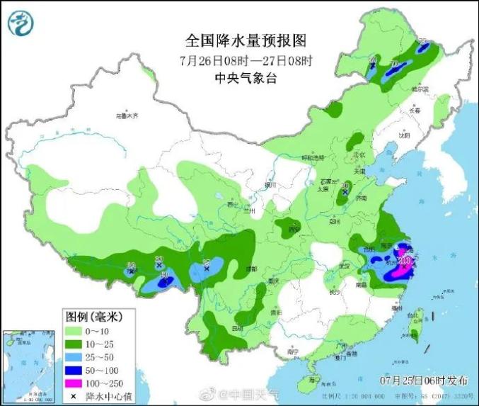 今天,中央气象台发布暴雨橙色预警:7月25日08时至26日08时,浙江中北部、上海、江苏南部、安徽南部、台湾岛南部、内蒙古中部、吉林西部、黑龙江西部、海南岛西南部、云南南部以及青海东北部、甘肃东部、陕西北部、山西北部、河北北部等地的部分地区有大雨或暴雨,其中,浙江北部、上海、江苏东南部、安徽东南部、内蒙古中部等地的部分地区有大暴雨,浙江北部局地有特大暴雨(250~360毫米)。上述部分地区伴有短时强降水(最大小时降雨量30~60毫米,局地可超过80毫米),局地有雷暴大风或冰雹等强对流天气。