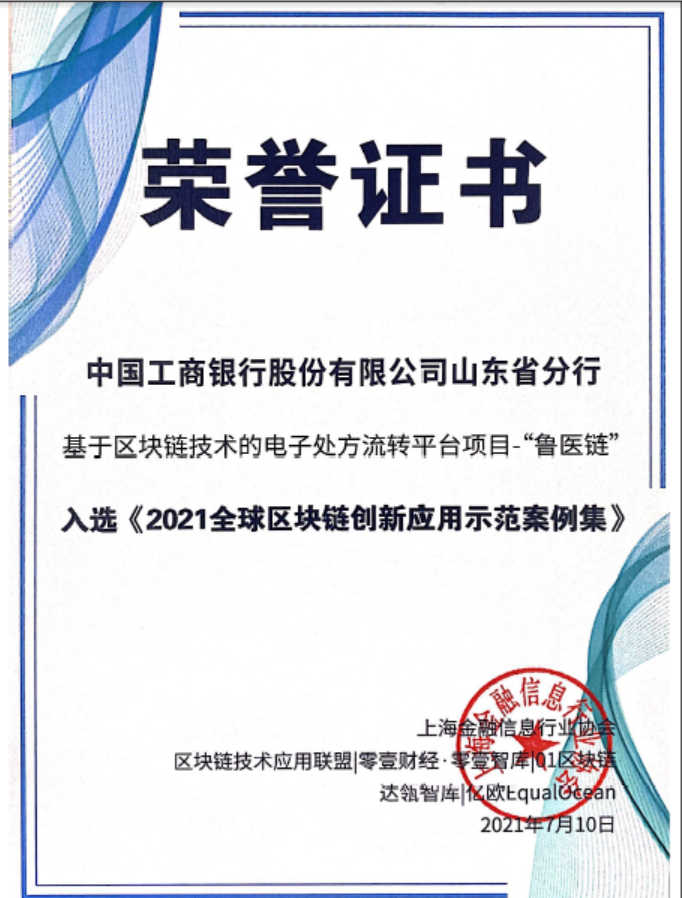 在7月10日召开的2021世界人工智能大会“链络全世界 智造新城市”区块链论坛上,山东工行基于区块链技术的电子处方流转平台项目“鲁医链”成功入选《2021年全球区块链创新应用示范案例集》,获得区块链行业组织高度评价。