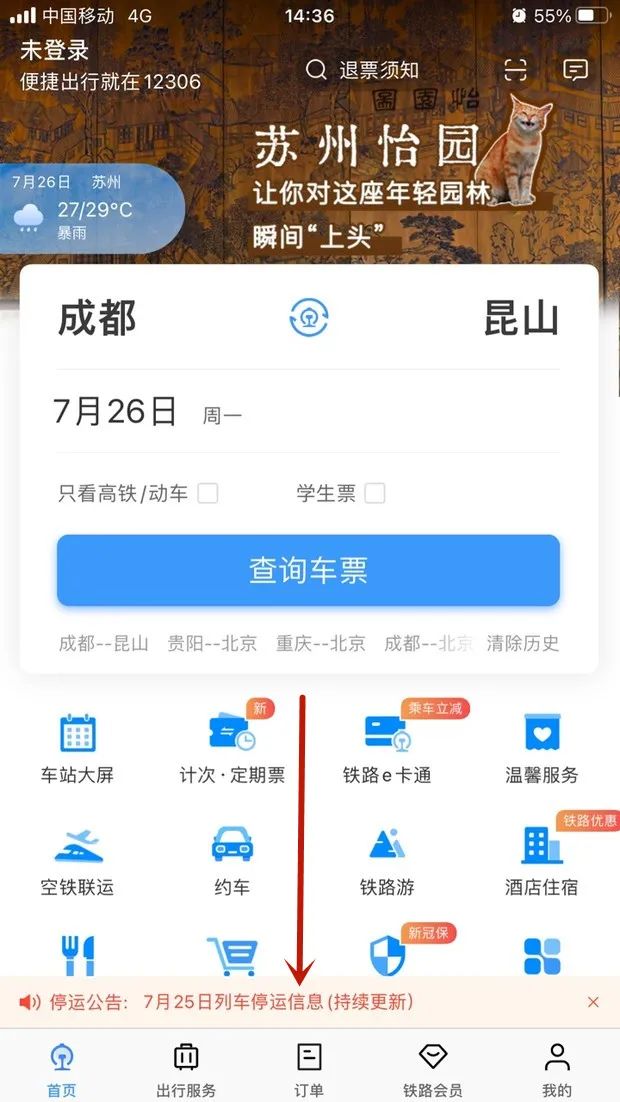 受台风“烟花”影响,12306电话呼入激增,人工客服等待时间久,微博、微信咨询量大,不能及时回复各位大家,小编温馨提示各位即将出行且想了解停运列车信息的小伙伴,还可通过铁路12306手机APP查询,以免耽误行程。查询方式如下图↓↓↓