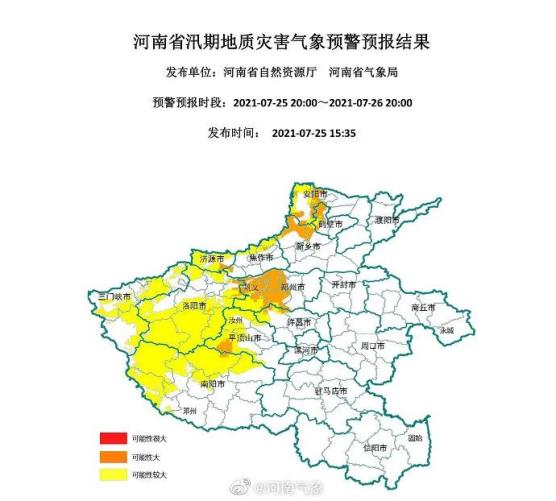2021年07月25日20时至26日20时,河南省地质灾害预警预报达到橙色预警的地区为:郑州大部,安阳、鹤壁、平顶山西部,新乡、许昌西北部,焦作周边,济源东南部,三门峡东北部,洛阳东部,南阳北部,巩义大部,发生地质灾害的可能性大。地质灾害预警预报达到黄色预警的地区为:济源、三门峡、洛阳、平顶山、南阳大部,安阳、鹤壁西部,新乡、许昌西北部,焦作西部及北部,郑州西南部及北部局部,汝州大部,巩义南部,邓州西南部,发生地质灾害的可能性较大。暴雨洪灾来袭如何应对?