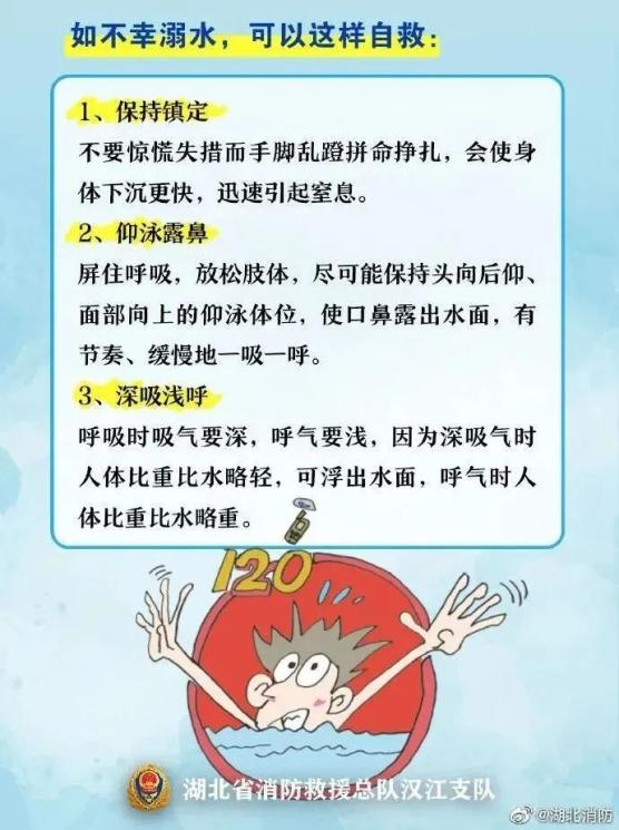 7.当发生溺水时,不熟悉水性时可采取自救法:除呼救外,取仰卧位,头部向后,使鼻部可露出水面呼吸。呼气要浅,吸气要深。此时千万不要慌张,不要将手臂上举乱扑动,而使身体下沉更快。