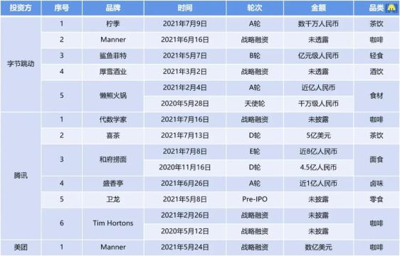 2021年截至目前,字节跳动、腾讯和美团投资餐饮消费项目一览