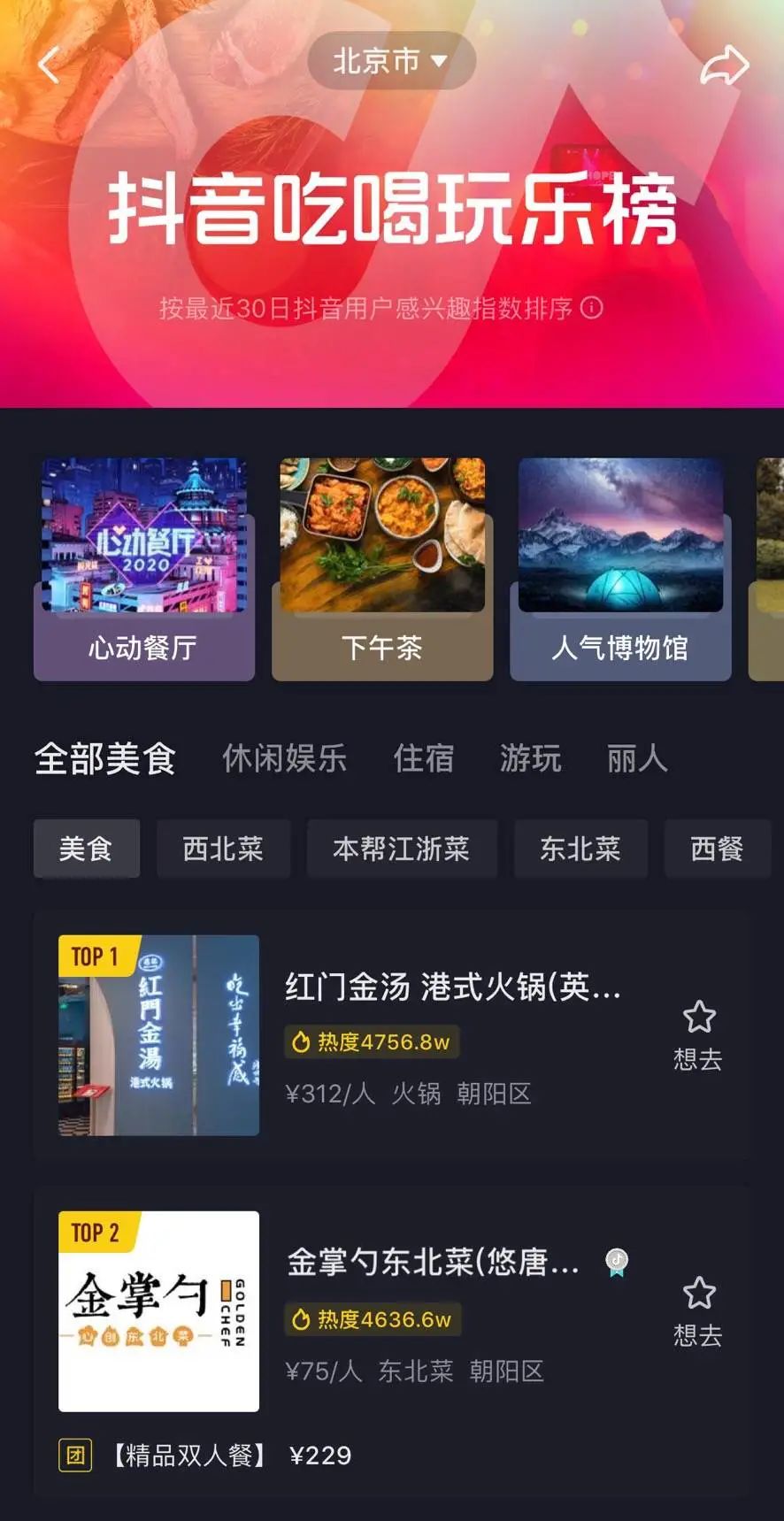 今年,抖音再推出“抖音吃喝玩乐榜”,包涵美食、休闲娱乐、住宿等5个榜单。据Tech星球报道,近期,抖音开始内测“心动外卖”,大概率会邀请抖音内的餐饮商家入驻。