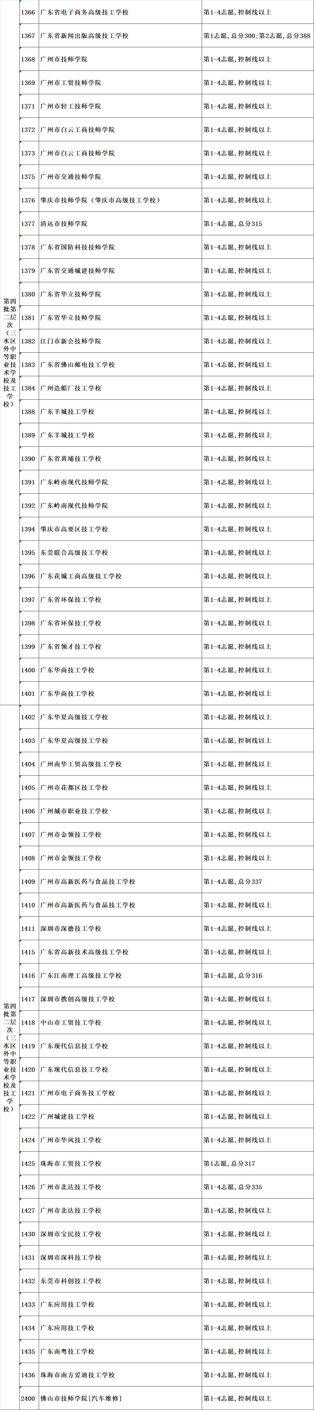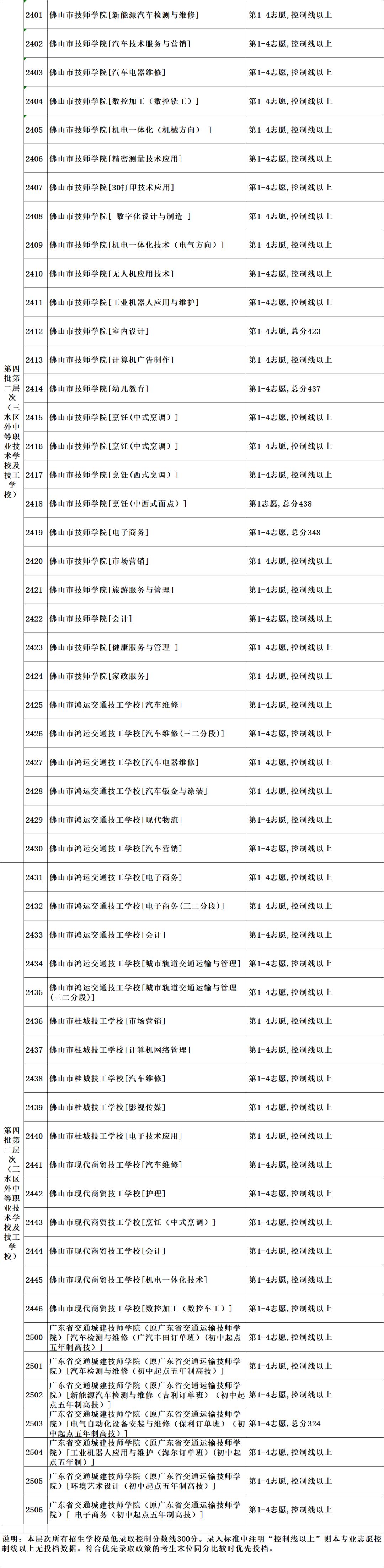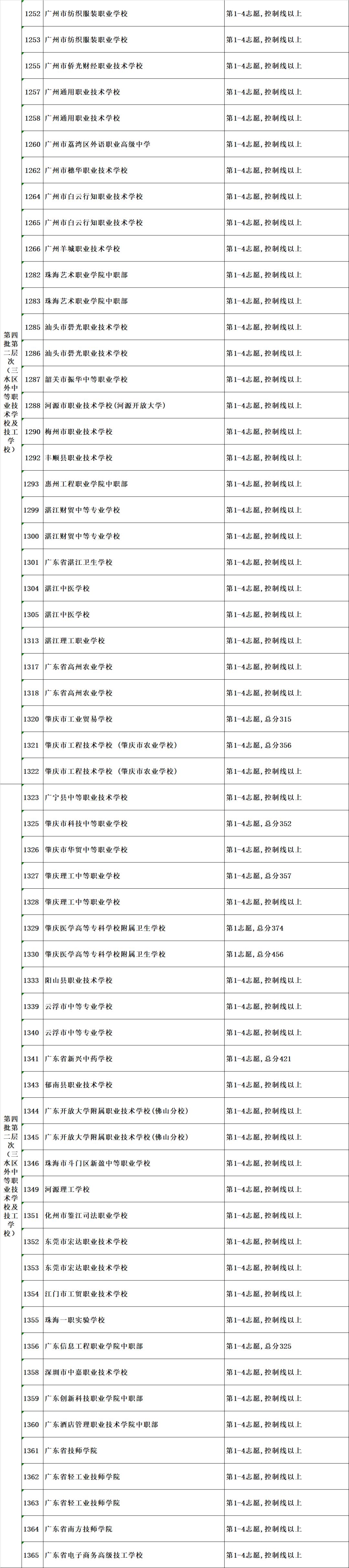 区内职业技术学校(中高职衔接三二分段试点专业<除对接佛职院、顺职院的专业外>、省市“双精准”项建设专业、省重点专业、特色专业、现代学徒制试点专业)、顺德体校面向全区招生,本层次最低录取控制分数线329分。在此分数线之上,部分学校的招生计划未完成的,根据考生志愿的先后顺序从高分到低分录取的原则,以5分为一个分数段依次降分投档,直至降至300分为止,顺德体校普通生招生计划未完成的,以5分为一个分数段依次降分投档录取,直至降至0分为止;具体录取标准详见附件1。