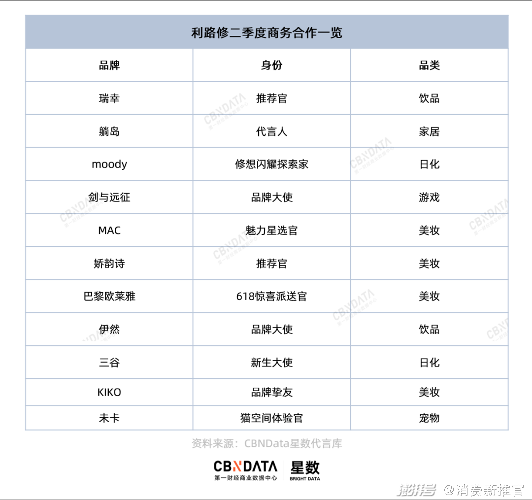 “佛系”、“咸鱼打工人”成为利路修的个人标签,也吸引了很多品牌方的关注。整个二季度,利路修包揽了11个品牌合作,数量超过C位出道的刘宇,其中大多为短期合作型。品牌看中了利路修的话题度,以此为噱头引发消费者共鸣,在推广用语上更显巧思,如“修想闪耀探索家”,“修想下班”等,加深消费者记忆点。