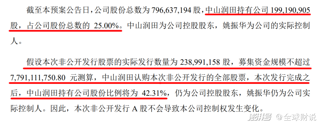 公告显示,中炬高新拟发行约2.39亿股,发行价格为32.6元/股,募资额为77.91亿元,发行对象为控股股东中山润田。