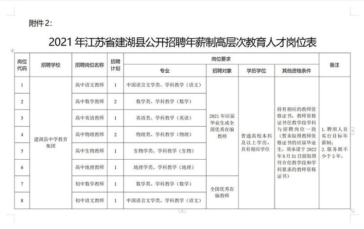 本次计划招聘高中学科教师8名、初中学科教师2名,具体招聘岗位详见《2021年江苏省建湖县公开招聘年薪制高层次教育人才岗位表》。