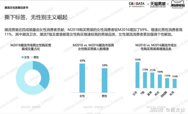 CBNData《2018潮流文化发展白皮书》显示,中性风格在潮流品牌中的市场增速高达340%,是整体服装市场的2.5倍。其中,女性消费者购买中性风格服装的增速高达468%,是男性消费者增速的2倍。