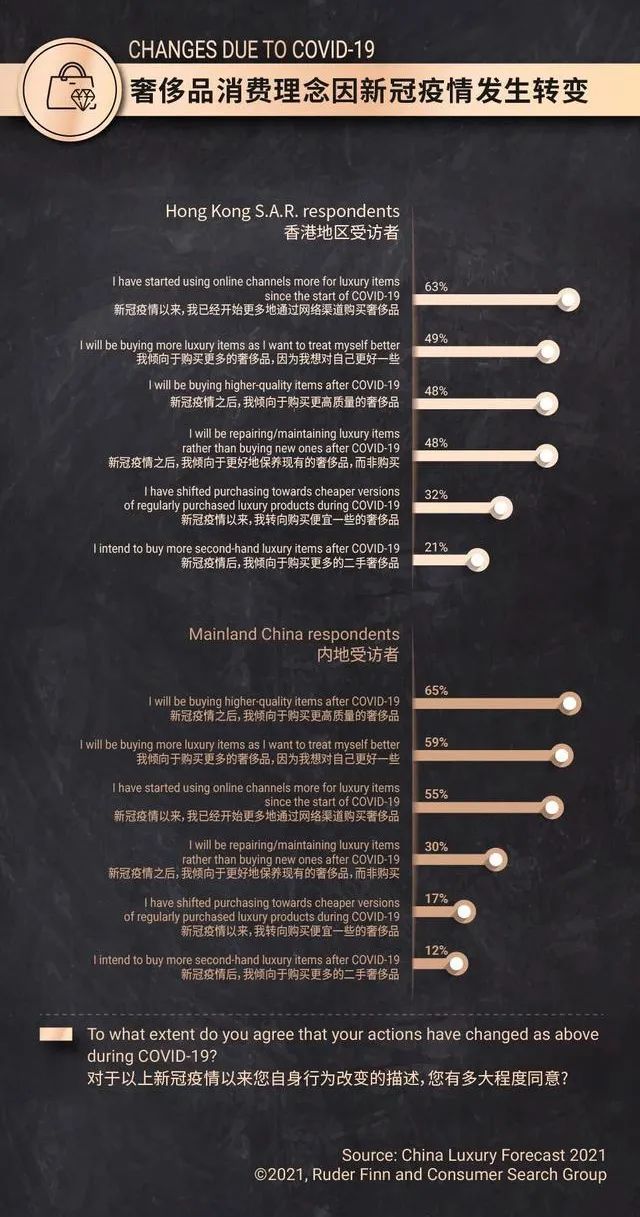 据罗德传播集团与精确市场研究中心联合发布的《2021中国奢华品报告》显示,65%的内地受访者和48%的香港地区受访者表示,新冠疫情以来会倾向于购买更高质量的奢侈品,内地59%和香港地区49%的受访者表示会购买更多的奢侈品来更好地对待自己。