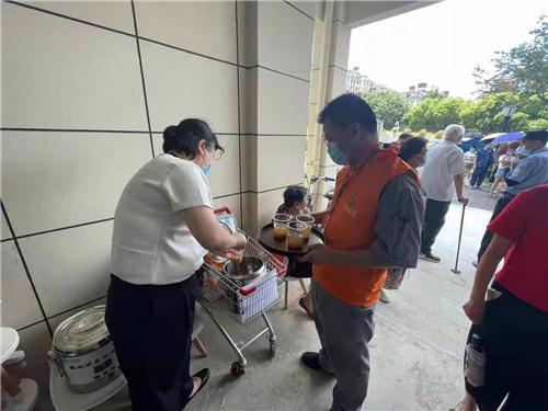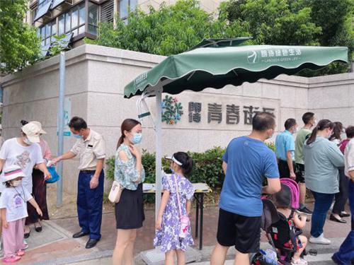 在核酸检测点,绿城服务人员为业主送去绿豆汤,口罩等夏日清凉,同时宣传防疫措施,疫情下,仍有绿城一路同行。