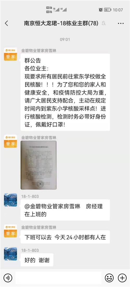 绿城服务南京公司及时启用南京区域所有在管项目紧急防疫响应工作,组织防控应急工作会议,重申防控相关工作要求。项目所有在岗人员积极配合街道防疫部署,统一进行健康监测核酸检测。工作人员防护到位,安全作业,项目内开展多频次防疫消杀工作,对于业主及外来人员做好防疫保障,确保零隐患。