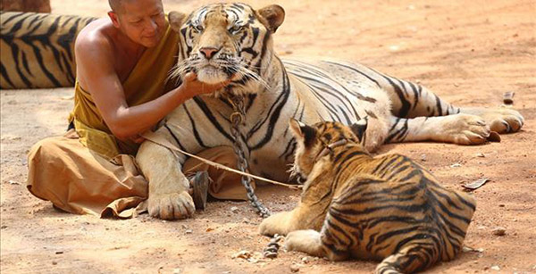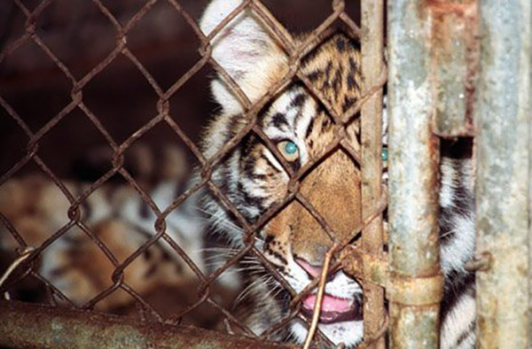 为了让幼虎听话且没有攻击性,人们在它们出生不久便将其与母虎分离,并对它们进行鞭打,使它们变得温顺。动物园的环境极其恶劣,为了能让人们与老虎站在一起,老虎都会被拴住或者限制在狭小的笼子内,一旦它们显示出一点点攻击性,等待它们的是直至驯服的鞭打。