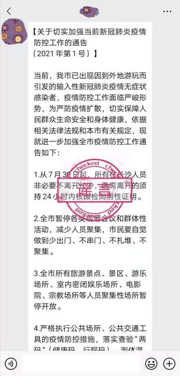 2021年7月30日,部分微信群流转出落款“中共长沙市委新冠肺炎疫情防控工作领导小组”的《关于切实加强当前新冠肺炎疫情防控工作的通告》,声称从7月30日起,所有在长沙人员非必要不离开长沙,确需离开的须持24小时内核酸检测阴性证明;全市暂停各类现场会议和群体性活动;全市所有旅游景点、景区、游乐场所、室内密闭娱乐场所、电影院、宗教场所等人员聚集性场所暂停开放。