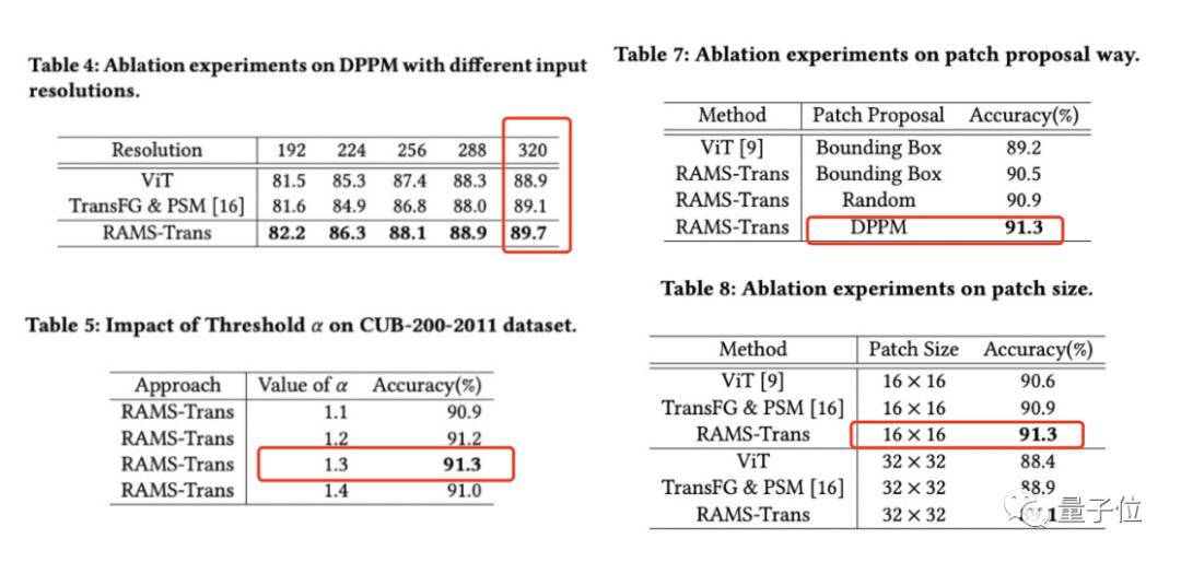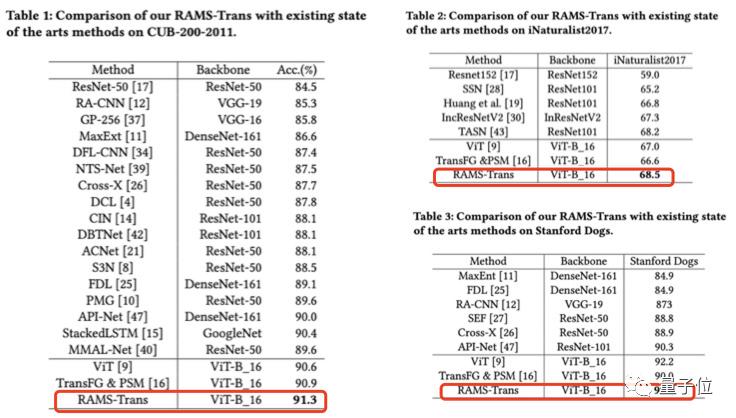 实验表明,除了高效的CNN模型外,RAMS-Trans的表现比同期进行的工作更好,分别在CUB-200-2011(鸟类识别)、Stanford Dogs(狗类识别)、iNaturalist2017(动植物识别)获得SOTA。