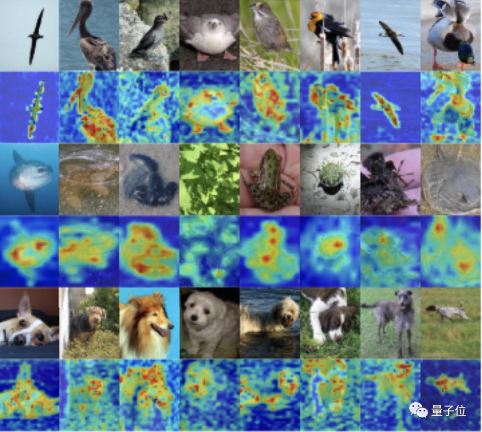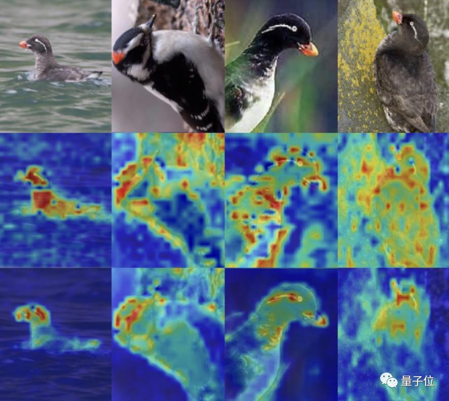 下图为RAMS-Trans在识别鸟类时根据注意力权重生成的注意图(attention map)。