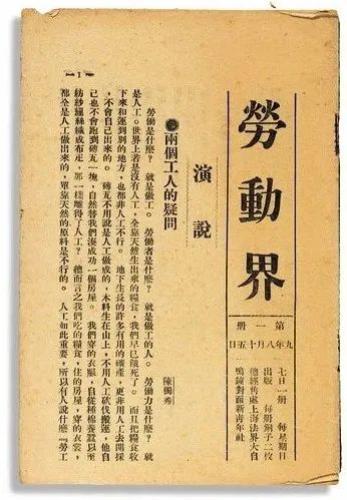 《劳动界》周刊,1920年8月15日由陈独秀、李汉俊发起创办。这是一份面向工人的通俗刊物,先后共出版了24册,于1921年终刊,每册一万字左右。周刊内容设有“国内劳动界”“国外劳动界”“演说”“读者投稿”等专栏,以简明通俗的语言、形象生动的比喻,向工人阐明了劳动者谋求解放必须进行社会革命等马克思主义的基本原理,以达到启发工人觉悟、推动工人运动的目的,同时它也是共产主义知识分子从事工人运动的具体实践。这本《劳动界》周刊创刊号由俞秀松父亲俞韵琴捐献给中共一大纪念馆,现为馆藏国家一级文物。