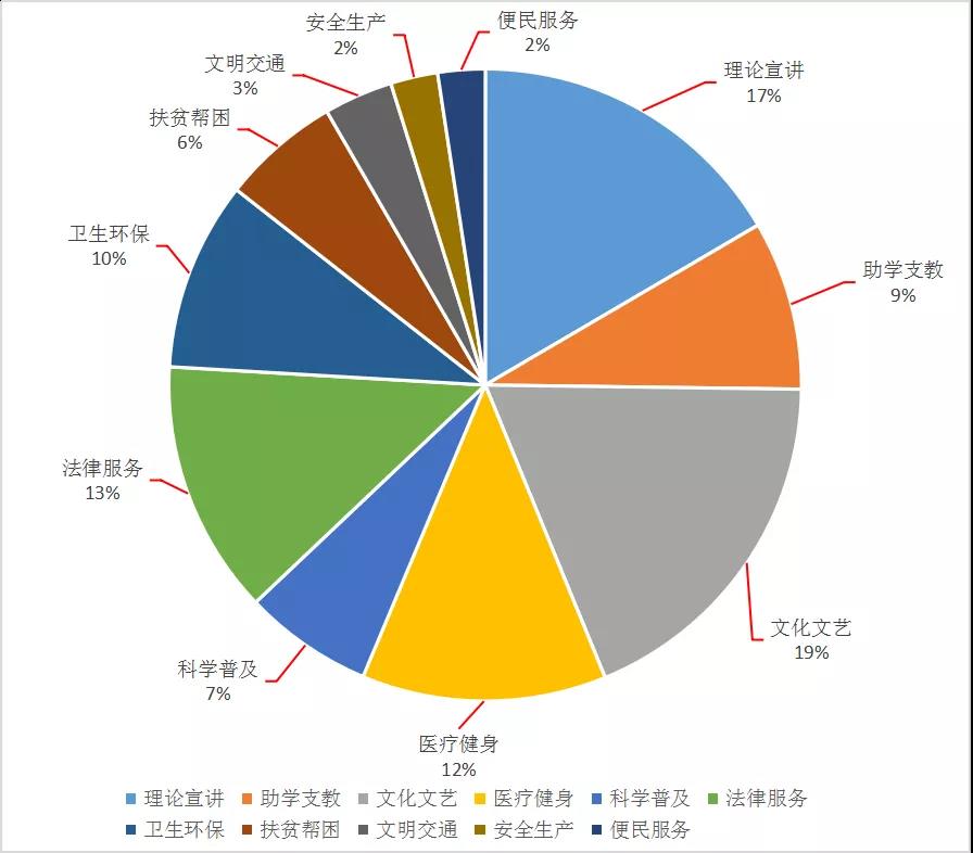 主题涵盖理论宣讲、助学支教、文化文艺、医疗健身、科学普及、法律服务、卫生环保、扶贫帮困、文明交通、安全生产、便民服务,其中文化文艺和理论宣讲志愿活动最热门。