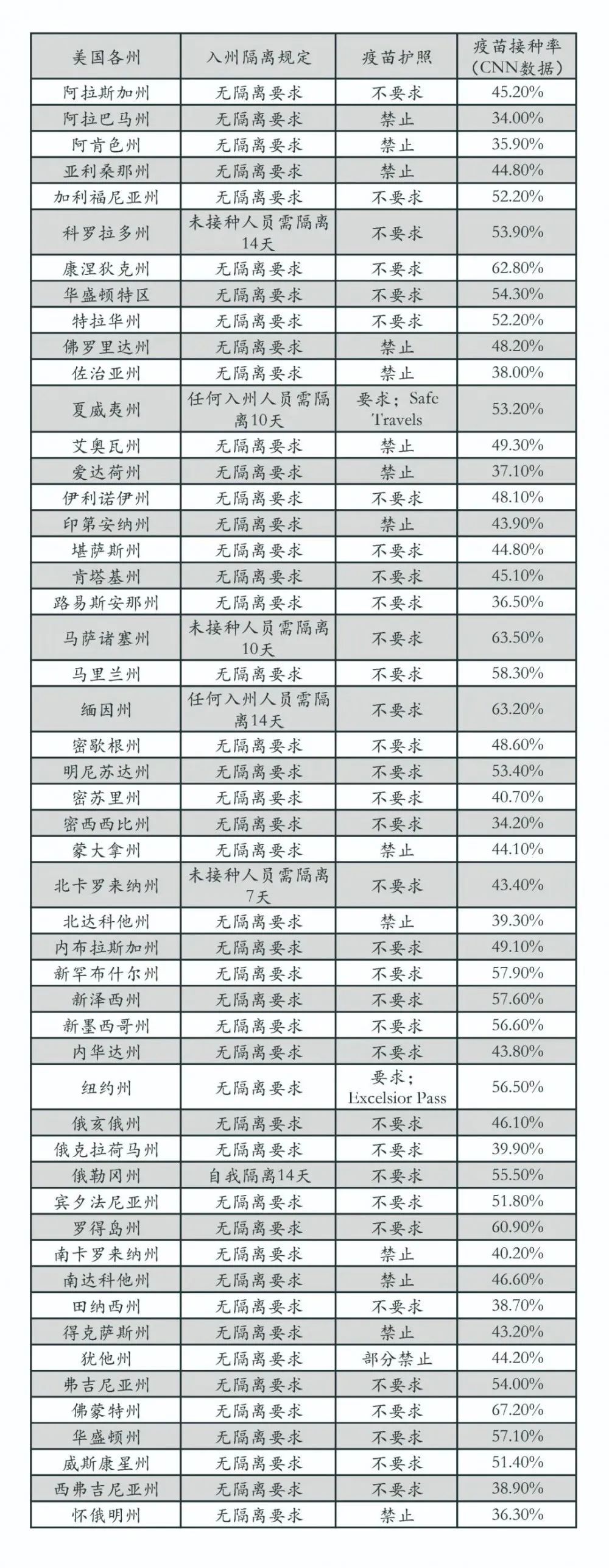 疫苗护照类似中国的健康码。截至2021年7月13日,美国15个州明确禁止使用疫苗护照,2个州要求并已投入使用(纽约州/Excelsior Pass;夏威夷州/Safe Travels),其余33个州均为官方不要求,详见附表。美国联邦政府明确不实行全国统一的疫苗护照。在苏已接种人员可以凭接种单、护照、身份证,照片在苏州国际旅行卫生保健中心(苏州新区长江路738号)开具中英文《疫苗接种或预防措施国际证书》。