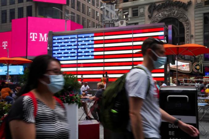 7月20日,人们走在美国纽约时报广场。王迎摄(新华社)