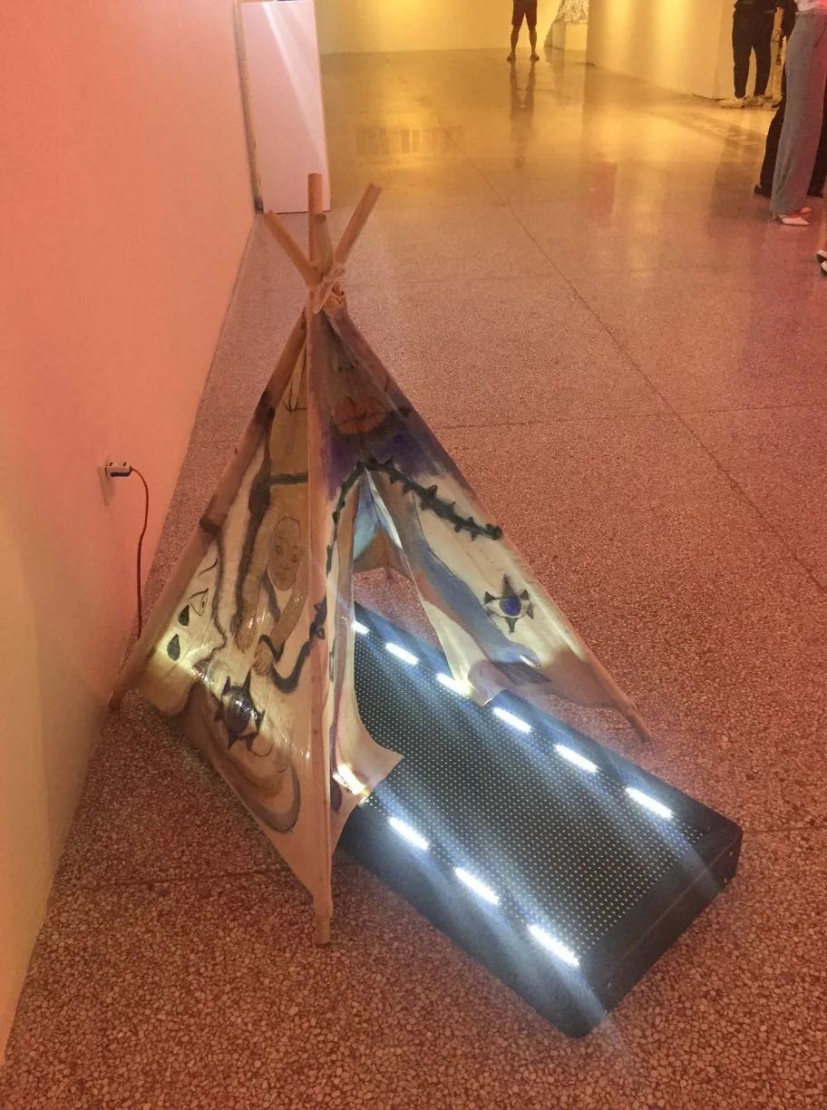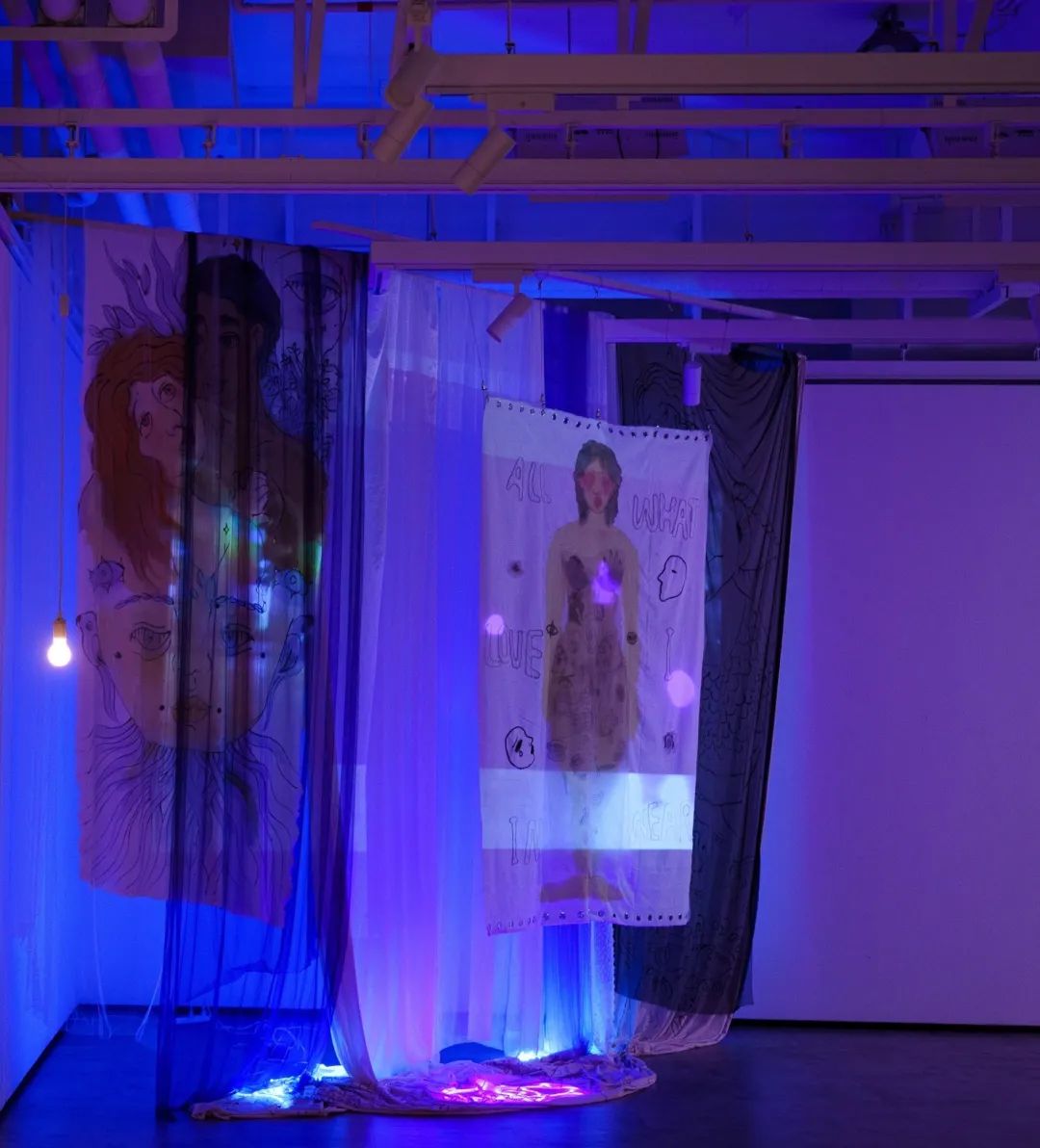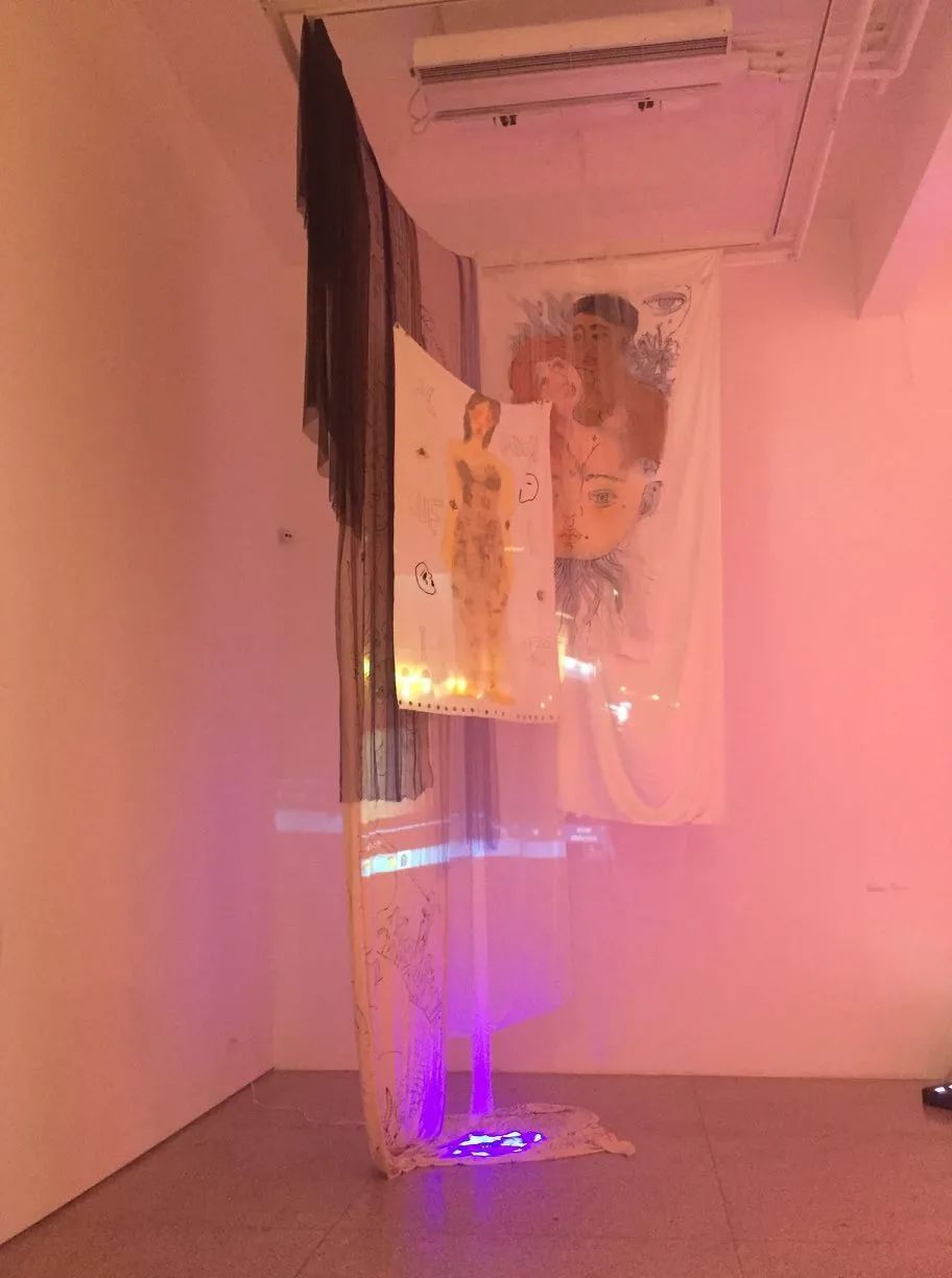 周池《ALL LOVE IN WHERE I EXIST》 布、影像 尺寸可变 2021作品自述:这是一个包含了很多层次的综合作品,我将绘画,手工,LED灯,影像等等尽可能的融合到一起。所以无法去具体定义这具体是什么,但可以从中发现我的表达:我表达亲情,友情,爱情,离别,相聚,孤独……最后的这一切被光和声音笼罩是一种,是一种很古老但又非常新鲜的感觉,很多人类会产生的情绪或者事件,都不能被明确定义,但遇见了就会产生那种似曾相识的感觉,这也是我想传达的。