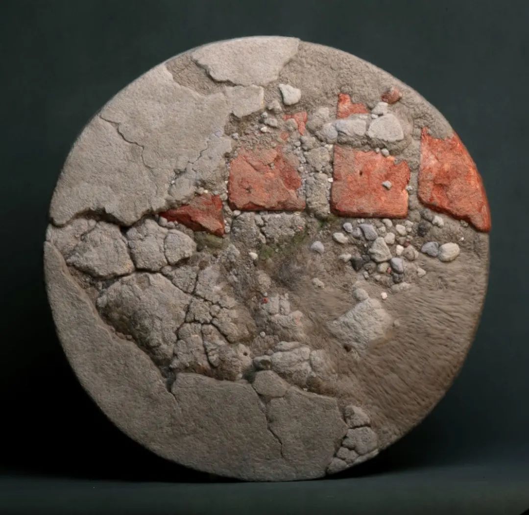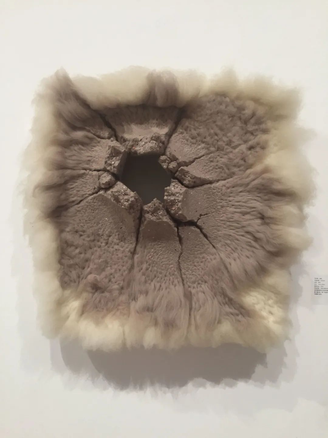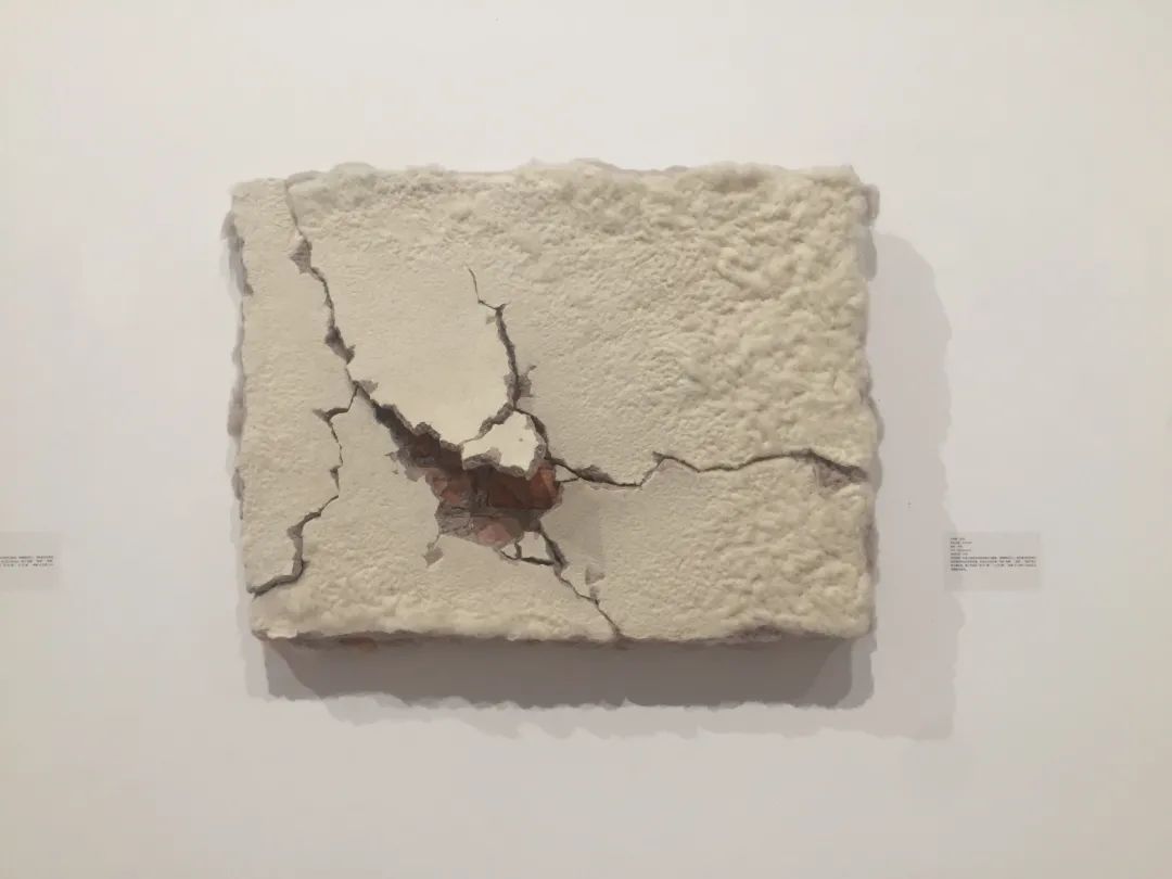 孙昀 38°52'; 48E, 115°26'; 58N 羊毛 65X65cm 2016年作品自述:作品以砖块水泥的形象作为载体,用戳刺的行为,将羊柔软的毛转化成坚硬的砖块水泥的形象,形成巨大的反差,其中“裂痕”、“破碎”、“残缺”等元素大量出现,整个作品将 “软”与“硬”、“冷”与“暖”、“表象”与“实质”几对对立与矛盾集中呈现。