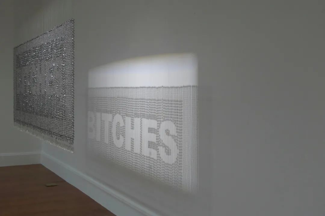 蔡雅玲 BITICHES 水晶珠、不锈钢丝j 200x220x3cm 2020作品自述:这个单词它其实有很多的含义,它不光是字面上的含义,在当下转变为一种女性的自信,或者说抛除掉性别的一种当下的社会一些事情的反应,。最美妙的一地方,在于它和影子之间的关系,作品是实的,然后影子是虚的,在布展中,当把后面的影子调的特别实,它就冲淡了前面的。当它摆动的时候,它带来的那种细碎、犹豫或者说不清楚的感觉,可能会增加很多更有意思的地方。
