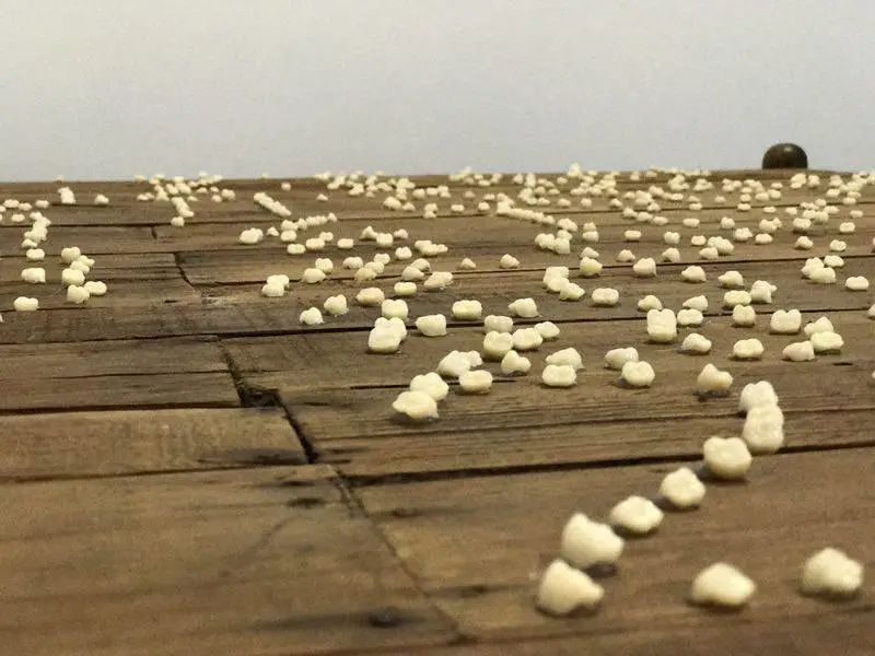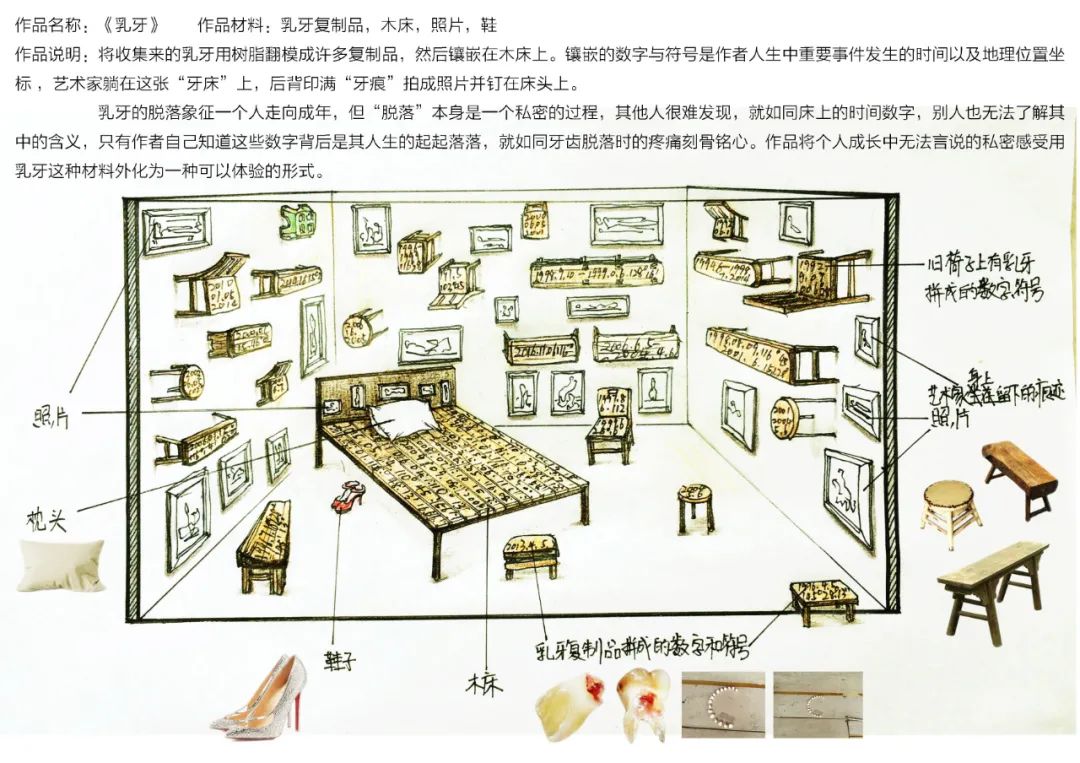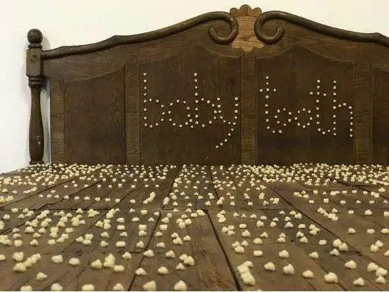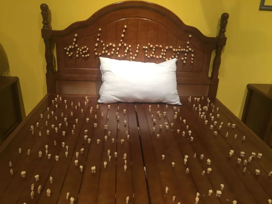 乳牙的脱落象征一个人走向成年,但“脱落”本身是一个私密的过程,其他人很难发现,就如同床上的时间数字,别人也无法了解其中的含义,只有作者自己知道这些数字背后是其人生的起起落落,就如同牙齿脱落时的疼痛刻骨铭心。作品将个人成长中无法言说的私密感受用乳牙这种材料外化为一种可以体验的形式。