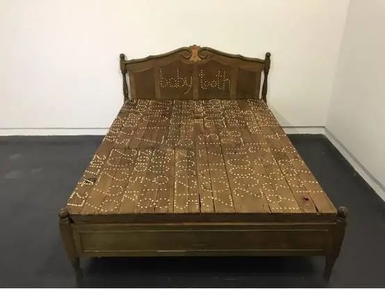 李琳琳 乳牙 乳牙复制品,木床,木凳,鞋,枕头,照片等 长5.8米,高4米,宽2米 2017—2021作品自述:将收集来的乳牙用树脂翻模成许多复制品,然后镶嵌在木床上。镶嵌的数字与符号是作者人生中重要事件发生的时间及地理位置坐标,艺术家躺在这张“牙床”上,后背印满“牙痕”拍成照片并钉在床上。