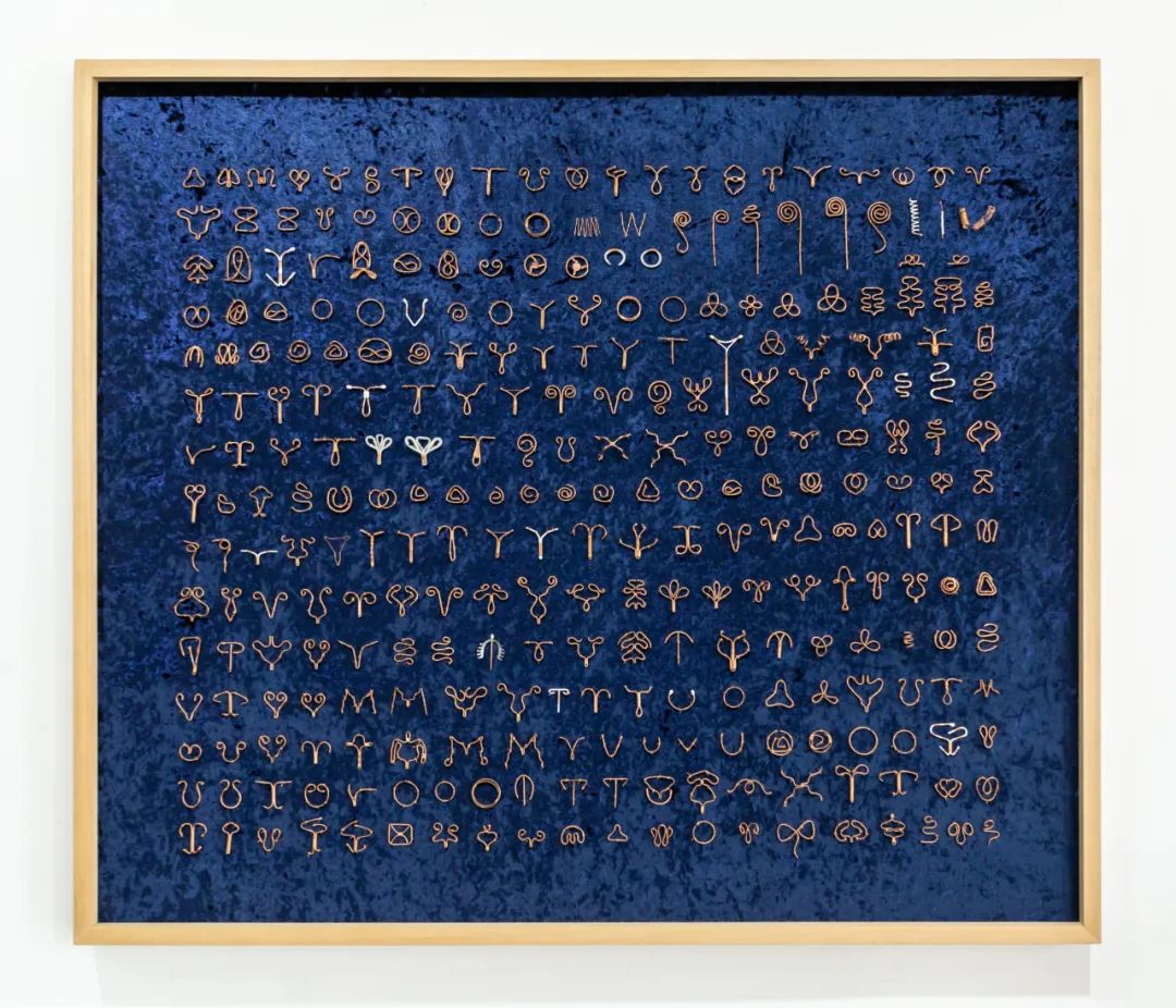 周雯静《女人系列•节育环》铜/PVC/硅胶 140*120cm*8个 2014作品自述:《女人系列•节育环》是关于两代女性节育与避孕问题的讨论,是我把家庭、母亲的个人历史,用载玻片放到了以政治、社会学为框架的显微镜下的成像。它缘起于2011年我母亲的取环事件给我生活带来的冲击,于是我开始着手研究节育环并采访了50位佩带节育环的女性。为此,2014年我创作了《女人系列•节育环》,使用了与早期节育环相同材料:铜,按照原比例大小,参照历史真实形状,把节育环制作成精美的首饰悬挂在蓝丝绒上。