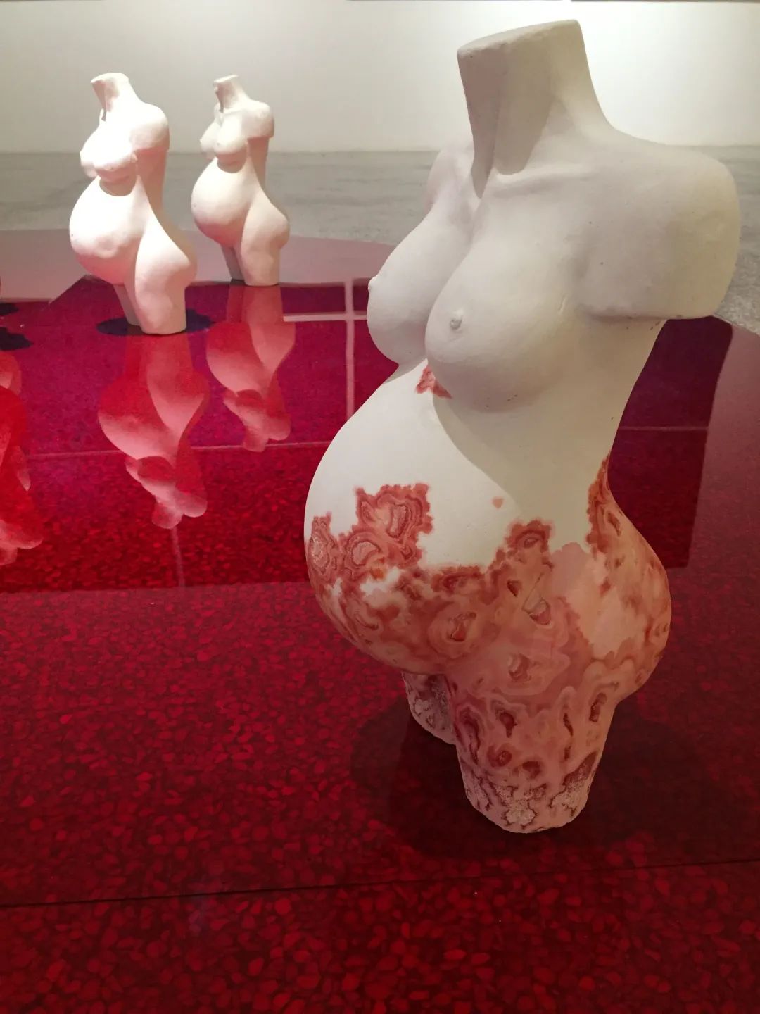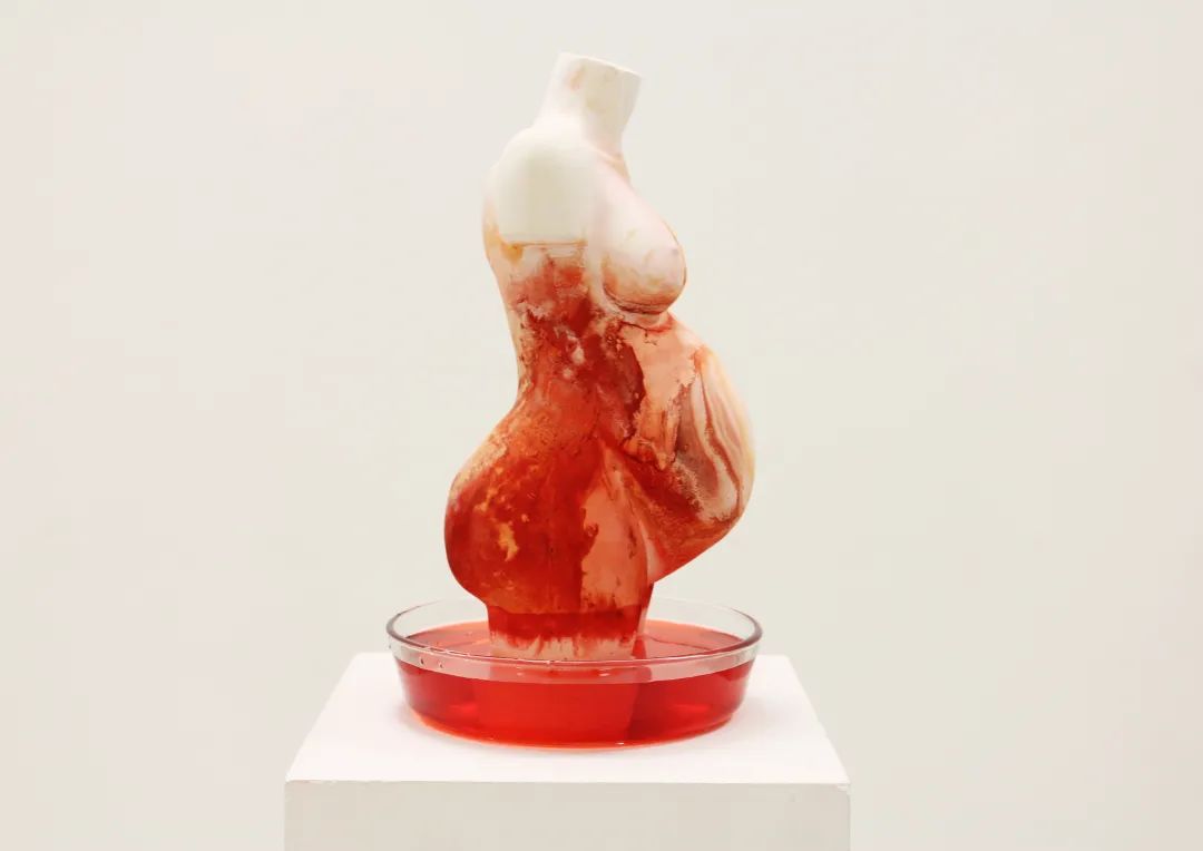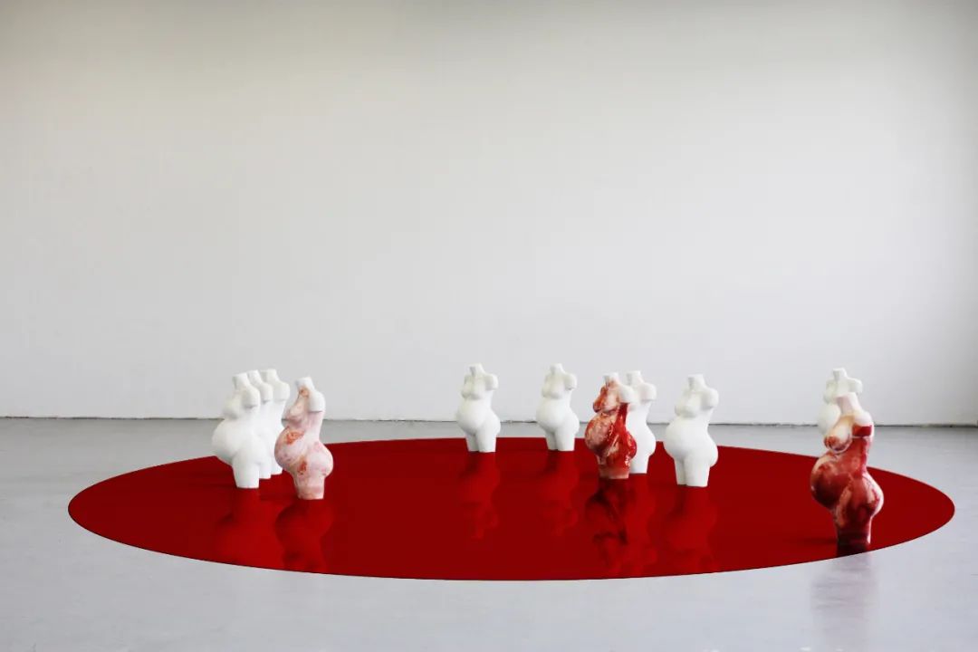 周雯静 红色系列Nº3 石膏 40*20*20cm*12 2016作品自述:《红色系列》中红色的第一层隐喻意义是“血液”。流血,是女性身体在生物性层面上所遭遇的最平繁的经历,不论是经期,生育,受伤或者疾病。其中《红色系列Nº3》,我制作了12个没有头、没有手、没有腿、没有一切个人和社会属性,只保留了女性生殖功能的躯体。这个孕妇雕塑,以洁白无瑕的石膏制成,雕塑底部浸入红色墨水,石膏吸附墨水之后红色如淋巴液一般慢慢在身体上攀爬、晕染。石膏缓慢吸水变干,反复的变化之中,浮现出某种抽象的疾病特征。它在石膏表面出现了黄色,白色的沉积物,像皮肤的分泌物一样让人不适。向上灌溉的过程中,红色墨水表达了一种远离美学的身体情境,身体被侮辱,被污染,被损害。妊娠过程不是洁白无瑕的,在今天,妊娠仍然被完美化,女性身体仍然存在于被蒙昧主义排斥的位置。