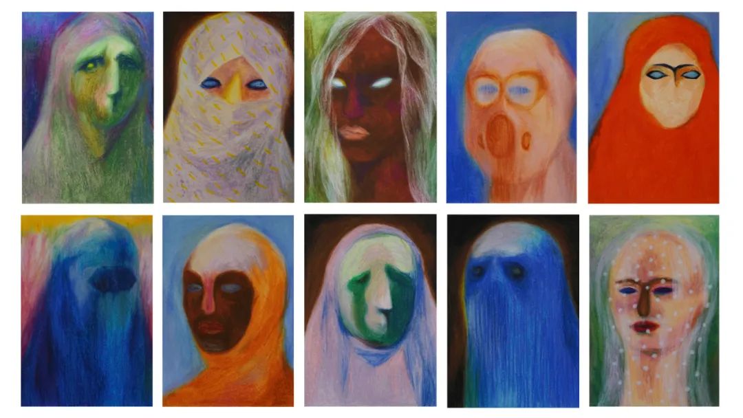 周雯静 女人面具 纸本绘画 29x21cm x10张 2020作品自述:从穆斯林女性的头巾Hijab到波卡Burqa,从战争中的防毒面具到婚礼当中新娘的头纱。女性的脸需要被遮盖的复杂性原因是什么?