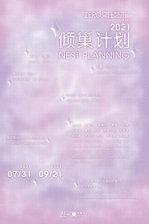 2021年7月31日, “ZERO女性艺术 + 倾巢计划2021”于北京798艺术区ZERO零艺术中心开幕,策展人艾蕾尔。“倾巢计划”女性艺术双年已持续三届。“巢“隐喻女性,“倾巢”具有颠覆之意,发掘未来的新生力量,寻求重建新秩序的可能性。参与本次展览的艺术家有曹睿欣、蔡雅玲、费雪、李隽、李琳琳、莫芷、孙昀、探微小组(成员:张茂源、王栩儿、邵青、何桢妮、高淑启)、吴嘉琪、徐丝易、余梦彤、周池、周雯静、周煜嵋。本次展览的十四位杰出女性艺术家的出生年代在80年至00年之间,整体偏年轻化,与其说她们代表生于不同年代的女性群体,不如说她们体现了各自的独特性和差异性。本次展览展出的作品包含影像、装置、综合材料等,而且本届展览展出作品大部分为艺术家特意为本次展览而创作,在国内首次展出。