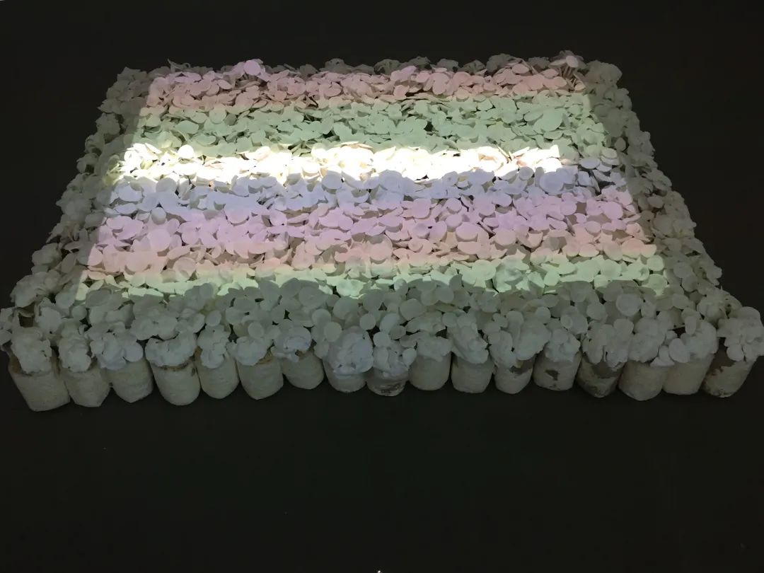 探微小组——张茂源、王栩儿、邵青、高淑启、何桢妮 《芳芳》 平菇/影像投影/摄影 2.5mx1.5m(影像投影),1mx1.5 m(摄影) 2021年5月作品自述:谈及女性,我们总不自觉地镀上一层温婉柔美的母性光辉,她们的社会角色是母亲,是妻子,是其他的种种,对待这些身份的认同也更大于“一个女人“本身。面对女性疾病,中年女性与年轻一代不同,也许是羞于启齿,妈妈辈的女人往往选择独自承受这些大大小小的病痛,就连伴侣也知之甚少。作品《芳芳》中的语言便是这些患病女性的诉说,通过展示大众眼里知性温婉独挡一面的女人们与疾病相处的点滴,让观者对于女性疾病有一个更富有“温度”的认识。