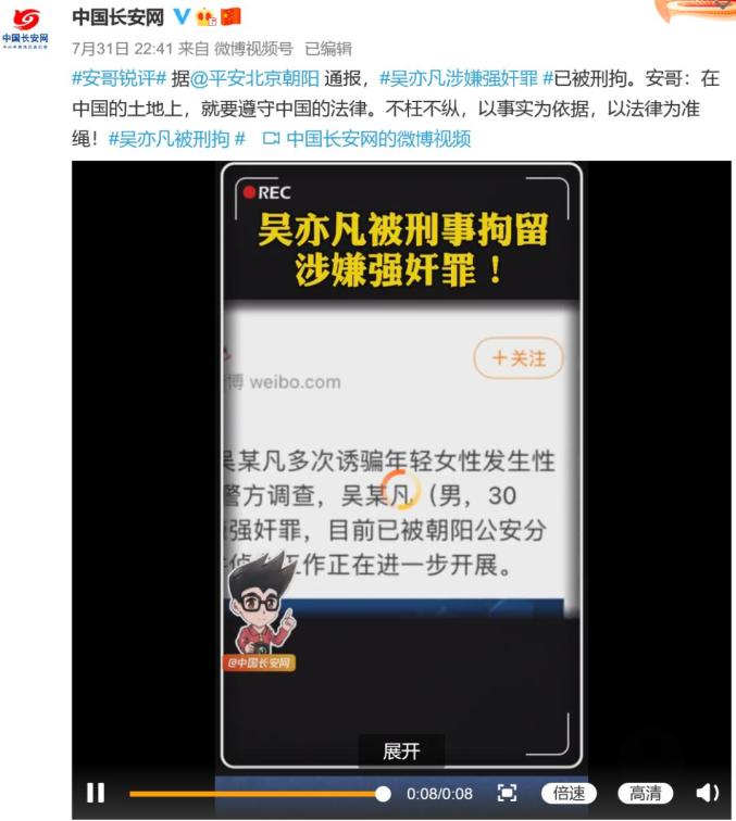 此前7月31日晚,北京朝阳警方发布信息,针对网络举报的“吴某凡多次诱骗年轻女性发生性关系”等有关情况,经警方调查,吴某凡(男,30岁,加拿大籍)因涉嫌强奸罪,目前已被朝阳公安分局依法刑事拘留,案件侦办工作正在进一步开展。