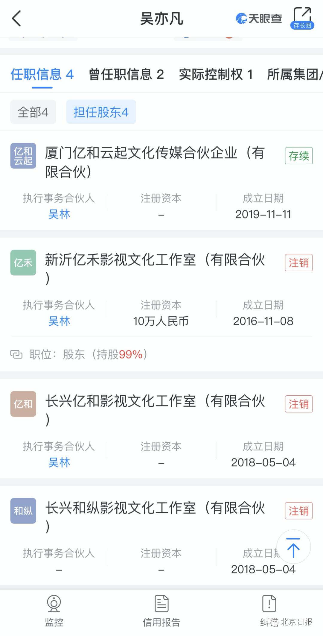 此外,天眼查App显示,目前吴亦凡关联公司仅一家厦门亿和云起文化传媒合伙企业(有限合伙)为存续状态,其余均已注销。该企业执行事务合伙人为吴林(吴亦凡表哥),吴亦凡持股99.99%,为大股东及最终受益人。