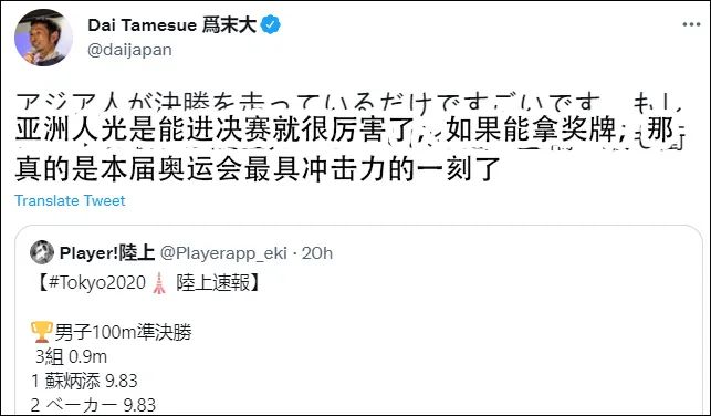 今天上午,日本前跨栏运动员、400米栏日本纪录保持者、现体育评论员“为末大”(Dai Tamaesue )也在Twitter写道,“亚洲人光是能进决赛就很厉害了!”