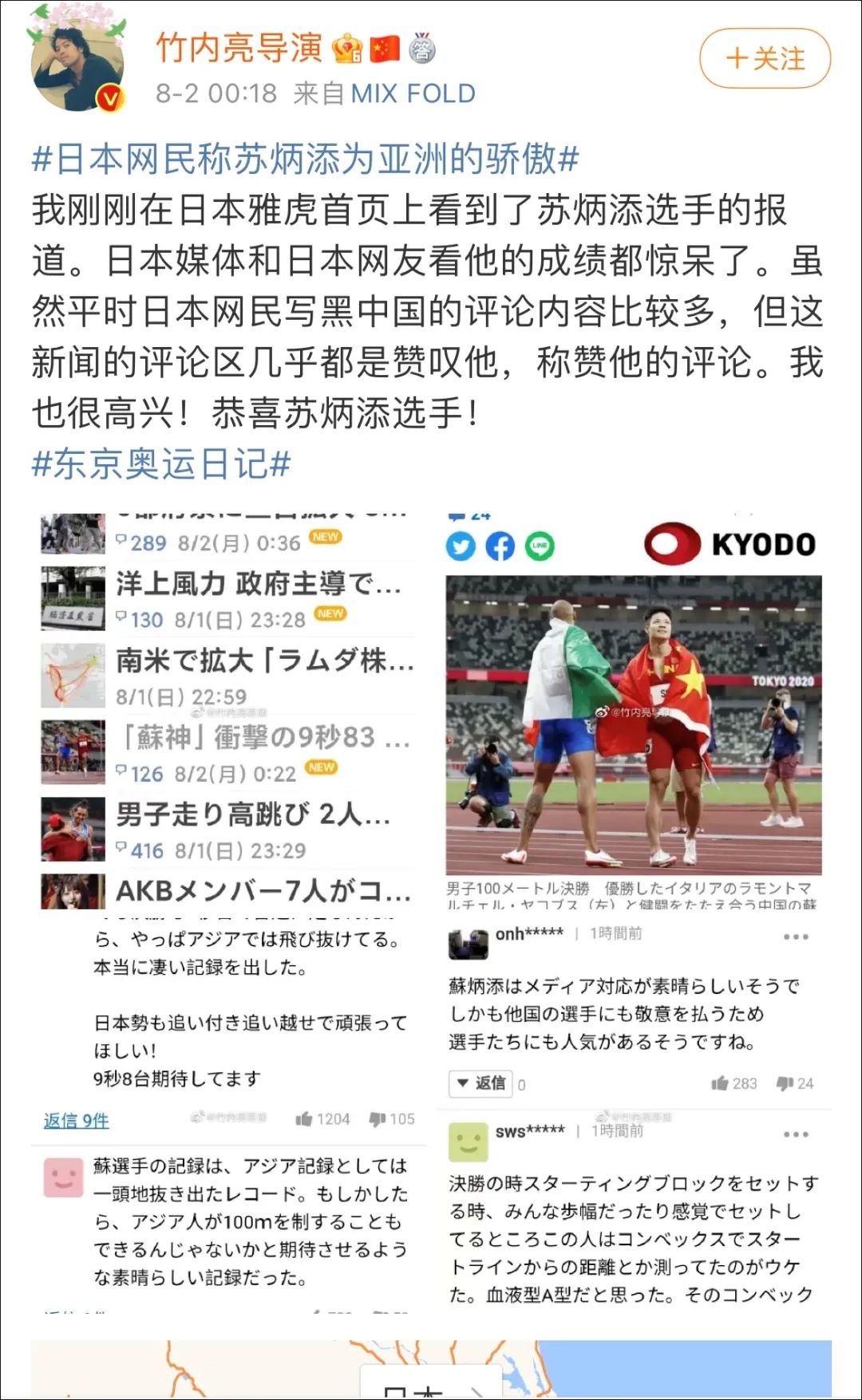 今天凌晨,日本@竹内亮导演 也在微博恭喜苏炳添拿下了如此好的成绩,同时表示“日本媒体和日本网友看他的成绩都惊呆了,新闻的评论区几乎都是赞叹他,称赞他的评论。我也很高兴。”